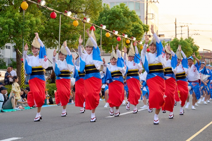 前年より阿波連と姉妹連を結び、藍響連は演舞構成を新たなかたちへと進化させています。男踊りでは、提灯を手放し団扇を持っての演舞に挑戦し、女性踊り手による男踊りも新たに加わりました。女踊りは、傘を使った本格的な演舞へと練習を強化中です。生まれ変わった藍響連の演舞を、どうぞご期待ください。