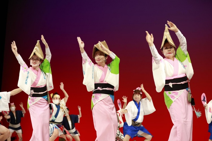 コスモス連、八潮飛潮連、幸手さくら連、イハシ連、朝日さわやか連の5連による合同連です。短い期間ではありますが合同練習をおこない交流を深めてきました。2年間の自粛期間を経て、待ちに待った南越谷阿波踊り。それぞれの衣装は異なりますが、心をひとつに、精一杯踊ります。