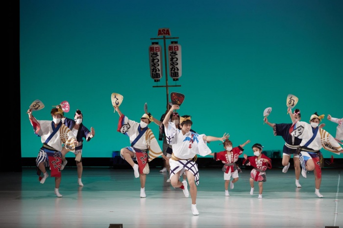 コスモス連、八潮飛潮連、幸手さくら連、イハシ連、朝日さわやか連の5連による合同連です。短い期間ではありますが合同練習をおこない交流を深めてきました。2年間の自粛期間を経て、待ちに待った南越谷阿波踊り。それぞれの衣装は異なりますが、心をひとつに、精一杯踊ります。