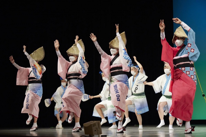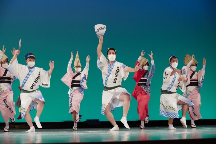 PO連、北辰工務連はポラテック株式会社で家を建てていただいたお客様と担当社員で構成された連です。踊りは徳島のんき連さんより直にご指導をいただき本格的な「のんき調」連として約10年前から活動をしております。男踊りは背筋を伸ばして大地を刻むような足さばきとキレのある華麗なうちわさばきが特徴です。女踊りはしなやかな足の運びで優雅に踊るのが特徴です。身体の全傾を